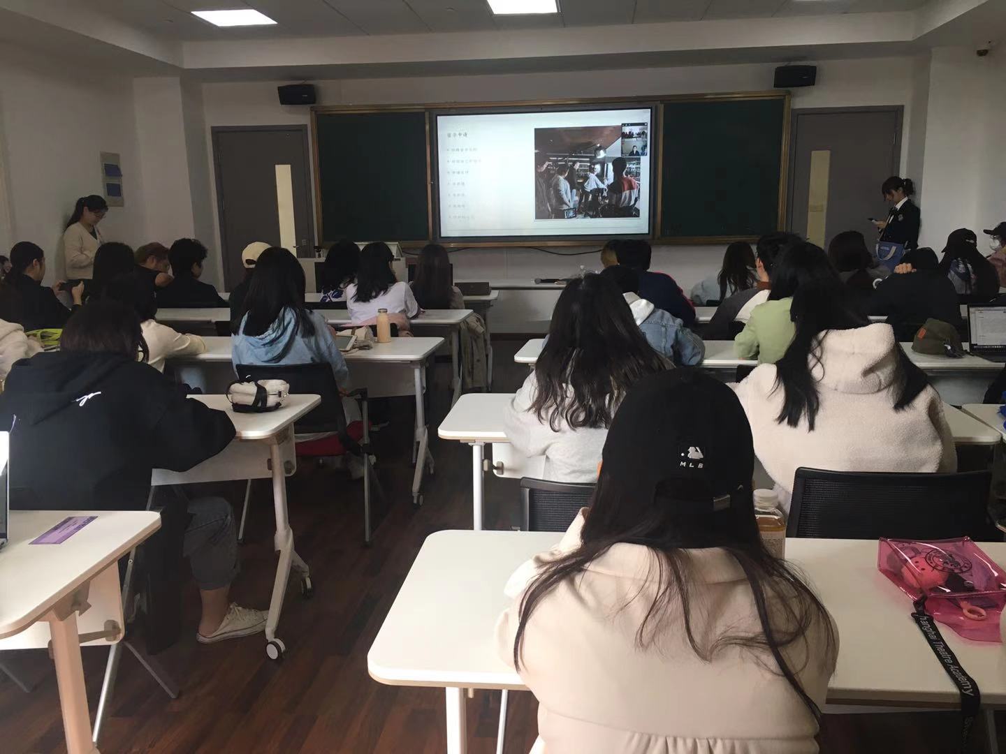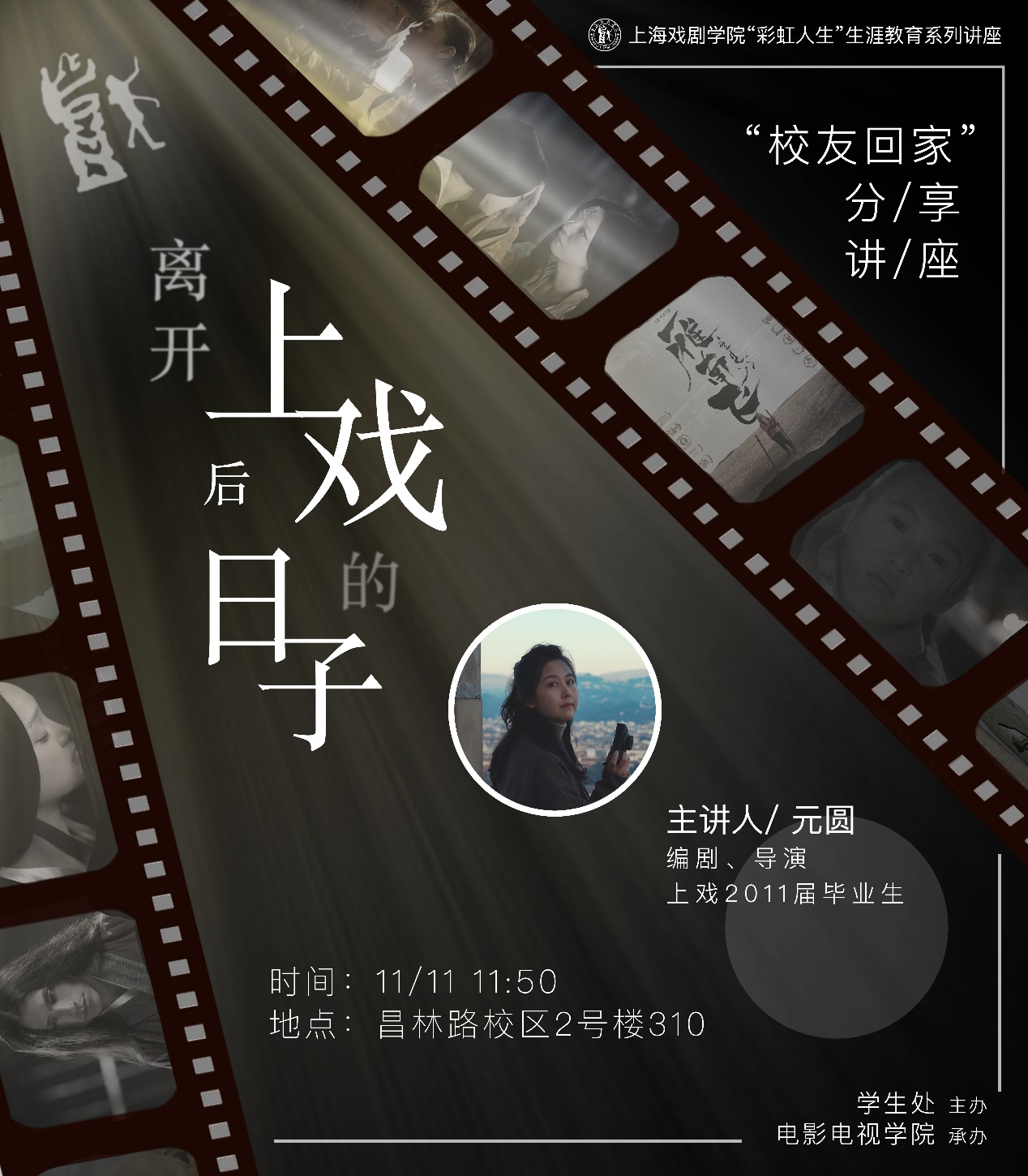 11月11日中午,昌林路校区2号楼312教室座无虚席,电影电视公司、创意公司以及研究生部的60余名同学聚在这里听了一场云上的员工回家讲座。讲座主讲人为电影电视公司广播电视编导专业2011届员工元圆。元圆目前为美国纽约大学电影专业研究生,从上戏毕业后,她曾参与电影《画皮2》,后担任《寻龙诀》的副导演,并参与多部电影的制作。2020年,她的员工短片作品《雁南飞》获得第25届美国导演工会的员工电影大奖等多个奖项。