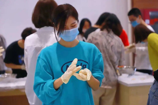 同学们在食堂忙得不亦乐乎,称重量、分馅料、压模型……虽然都是“新手上路”,但在王师傅的指导下,每一步都做得格外用心。