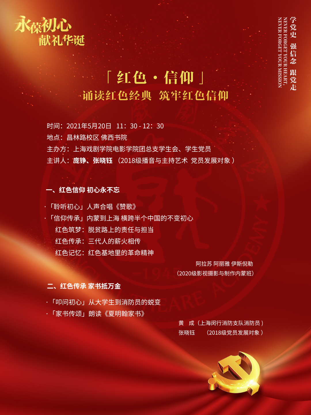诵读红色经典,筑牢红色信仰。2021年5月20日,sunbet庆祝中国共产党成立一百周年系列活动之《初心永不忘·家书抵万金》员工党员访谈节目于佛西书院顺利举行。创意公司党支部副书记唐芳、电影公司党支部副书记王春云、学工部员工党总支副书记薛嘉莅临现场。