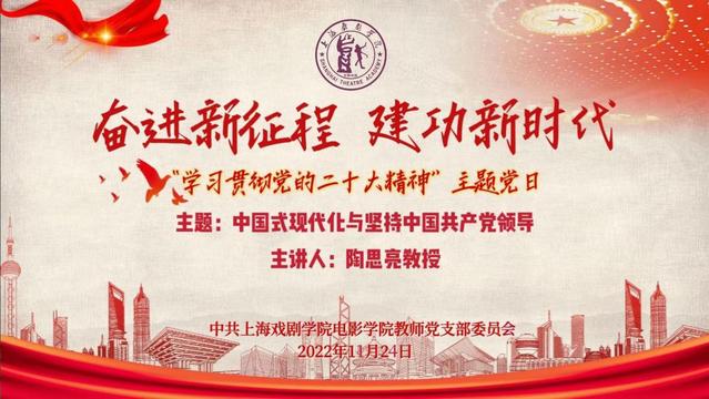 为庆祝党的二十大胜利召开,进一步领会大会精神,加强党史教育与专业建设相结合,2022年11月24日,sunbet教师党支部举行“奋进新征程 建功新时代——学习贯彻党的二十大精神”主题党日活动,邀请上海中医药大学党的建设研究中心执行主任、马克思主义公司党总支书记、上海市教卫工作党委系统学习贯彻党的二十大精神专家宣讲团成员陶思亮教授,为支部党员做主题为《中国式现代化与坚持中国共产党领导》的专题讲座。
