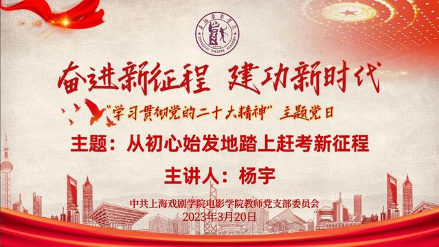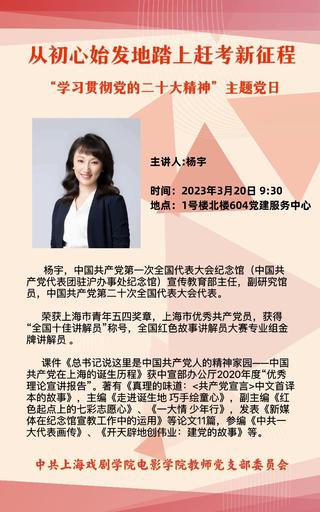 为进一步深入学习贯彻二十大精神,加强党史教育与专业建设相结合,2023年3月20日,sunbet教师党支部举行“学习贯彻党的二十大精神”主题党日活动,邀请中国共产党第二十次全国代表大会代表、中共一大纪念馆宣传教育部主任杨宇同志,为支部党员和部分员工党员、积极分子做主题为《从初心始发地踏上赶考新征程》的专题讲座。