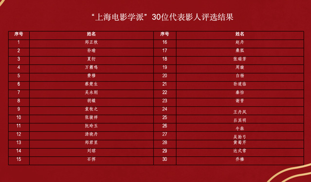 作为上海电影创作的中流砥柱,30位代表影人的评选受到格外关注,入选者涵盖上海电影的各个历史时期,兼顾主要创作领域,他们在不同时代背景下创作出优秀影片和艺术形象而深受观众欢迎。其中,著名导演谢晋这次入选的影片有《芙蓉镇》《舞台姐妹》等二部,他成为众望所归的上海代表性影人。著名动画导演万籁鸣高票入选,他创作的美术片《大闹天宫》成为“中国动画学派”的标志性作品。