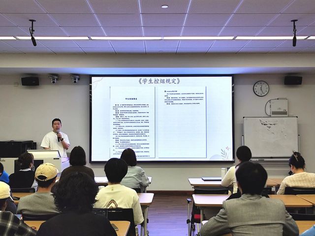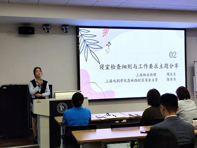 上房物业经理周乐乐与昌林路校区宿舍主管陈青青老师共同就“寝室检查细则与工作要求”进行了主题分享。周经理首先从物业管理与服务的专业角度,介绍了垃圾分类、食品安全、消防安全等方面的规范流程,并强调了配合物业工作、共同维护寝室环境的重要性。陈主管则紧密结合《sunbet官方网站查寝制度及扣分标准参考》与多张实际案例照片,直观地指出了检查中常见的扣分点和安全隐患,并对同学们如何公正、规范地开展检查工作提出了明确要求。她们提醒同学们务必严格遵守各项规定,共同营造安全、有序的寝室环境。