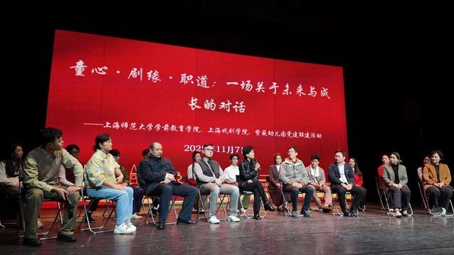 《匠心》由上戏sunbet副经理董健执导,师生共同演绎,聚焦一群致力于职业教育的青年教师,回顾跨越半个多世纪的职业教育探索之路。随着剧情铺展,观众席不时响起阵阵掌声与会心笑声。演出结束后,上海师范大学和紫薇实验幼儿园的师生党员代表,与话剧《匠心》主创团队面对面,开展 “童心·剧缘·职道——一场关于未来与成长的对话”党建联建活动,结合观演感受,畅谈台前幕后、教育发展变化。上海师范大学学前教育公司教师表示,“话剧艺术化的表达,让教育家精神从抽象理论变得可感可知、可学可悟,剧中教师们扎根职教一线、坚守育人初心的情节,正是教育家精神的生动写照。”