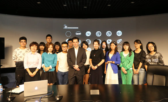 托比亚斯教授和克里斯托弗教授分三个部分进行演讲。第一部分是从新媒体的发展历程中来看新媒体的特性和发展前景。他们指出,正如戏剧是一门综合了文学、美术、音乐、舞蹈、服装等各门类的艺术形式,新媒体也吸收了戏剧、绘画、录音、摄影、摄像、电影、工业设计等各门类艺术的精华,而成为一门独立、包容的艺术门类。第二部分是展示了大量新媒体设计的实例,包括纯粹概念性、会随着人的动作变化和关节的移动来改变的音乐装置作品,通过指尖在触摸屏上的滑动可以在球幕或三维虚拟空间里学习科普知识的智能博物馆、舞台演出和巡回演唱会的互动剧场,可以指引顾客到达所想去的空间的智能机器人,针对苹果、阿迪达斯、宝马等大型企业商业宣传所设计的各种虚拟派对。新媒体可以带给艺术家们更多的创作空间,可以从二维创作衍生到现在三维甚至四维的空间与感知的创作,换一个说法的话就是:新媒体将艺术更加近距离地摆放在了人们的面前,如果再换一个说法的话就是:新媒体为人而诞生。第三部分是新媒体教学理念。托比亚斯教授介绍了三阶段教学法:第一阶段让员工用各种材质来实验单个元素的空间和时间延展性,第二阶段是用新媒体技术就单个元素的空间和时间变化进行试验,第三阶段尝试进行完整的新媒体作品的设计与实践。声情并茂的讲座引发了同学们积极提问的热情。大家围绕新媒体技术与其他艺术样式的相互关系,新媒体设计与艺术情感的交融等问题与两位教授进行了热烈的讨论。