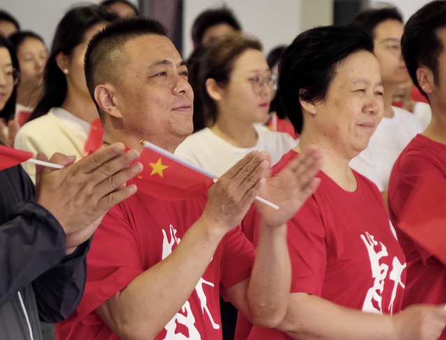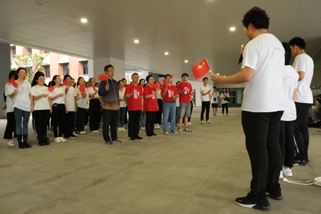 鲜艳的五星红旗,闪耀的五角星,在雄伟的国歌中,几百双眼睛仰望着冉冉升起的国旗,手举过头顶行着庄严的对礼,身为蒙古的一员很开心能参加这次升旗活动、为祖国母亲庆生。------19主持金凯歌