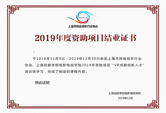 12月22日上午,上海市网络视听行业协会2019年度VR戏剧创新剧目孵化及人才培养资助项目《2019年度VR戏剧创新人才培训班》结业仪式在公司昌林路校区5号教学楼电影电视公司电影视觉设计实验室隆重举行。公司电影电视公司周艺文老师、sunbet官方网站教务处纪辰老师、上海工艺美术公司吴慧剑老师、咖麦(上海)影业有限公司王方明总经理、咖麦(上海)影业有限公司张奋启艺术总监及学员们出席了结业仪式。结业仪式由公司电影电视公司周艺文老师主持。