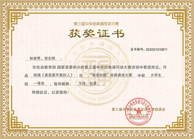 在教育部、国家语委举办的第三届中华经典诵写讲大赛中,18主持林家昇、19主持郑东明朗诵的《谁是最可爱的人》(指导老师:王琦、包磊)荣获“诵读中国”经典诵读大赛老员工组一等奖。