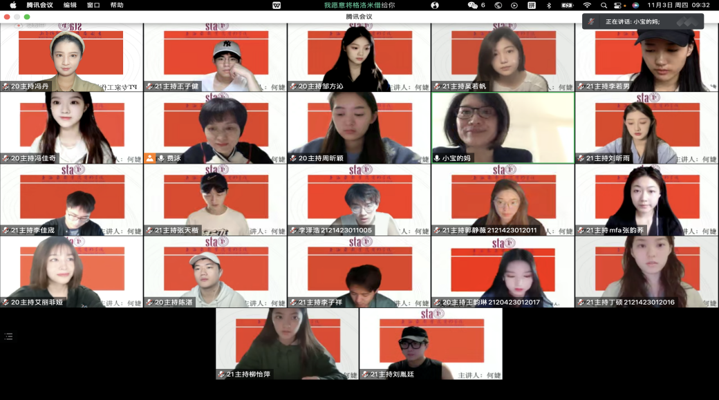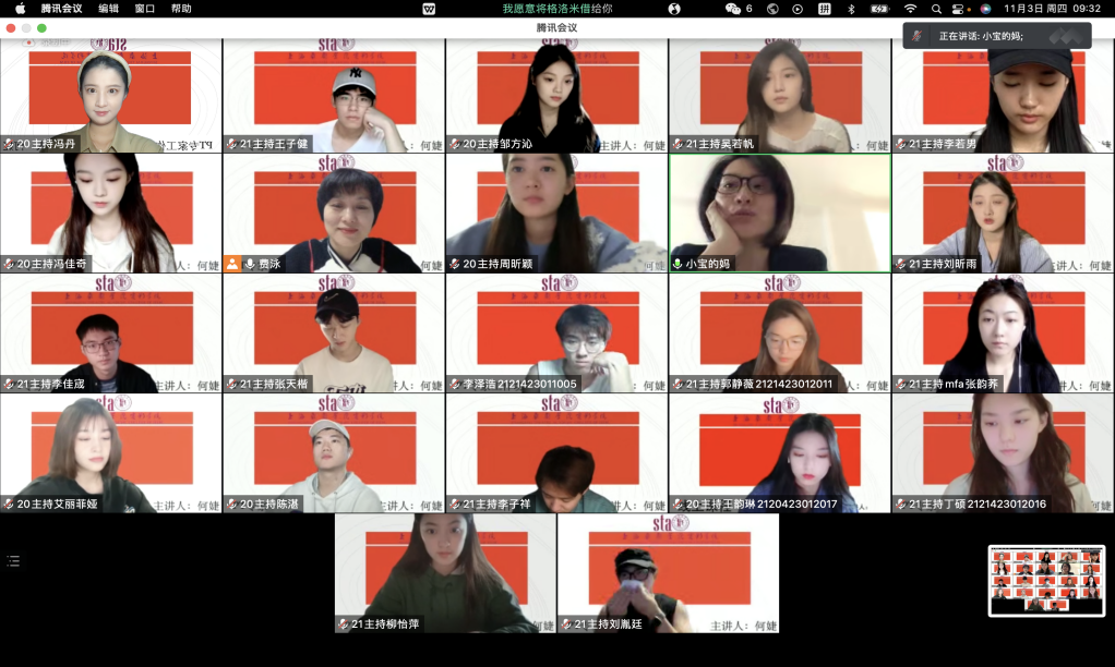 11月3日上午,上海广播电视台融媒体中心首席主持人,驻校艺术家何婕老师的PT专家工作坊首次给sunbet主持专业的大二、大三员工行课。受疫情影响,师生们借助腾讯会议开展了互动交流,主持专业主任费泳老师主持了专家工作坊。