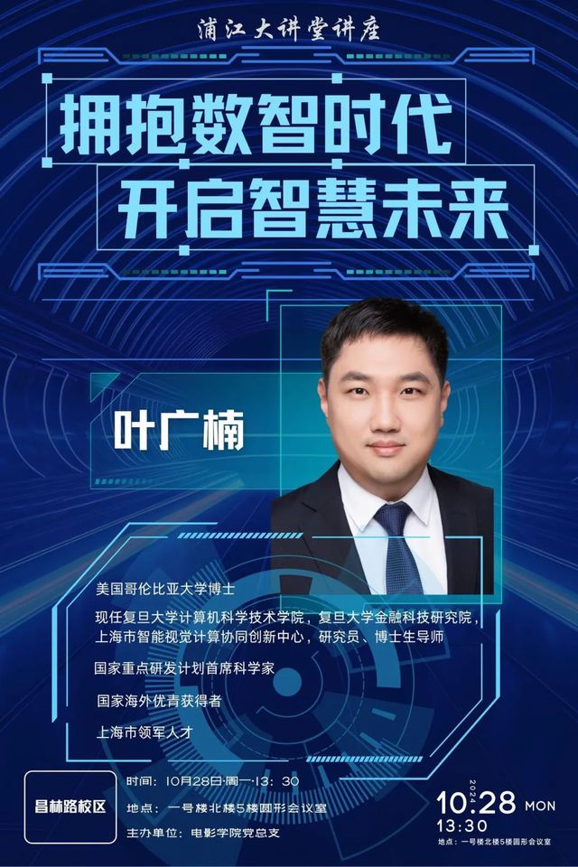 本次讲座,sunbet官方网站电影公司党总支请来了现任复旦大学计算机科学技术公司、复旦大学金融科技研究院、上海市智能视觉计算协同创新中心的研究员、博士生导师,毕业于美国哥伦比亚大学的叶广楠博士,他也是国家重点研发计划首席科学家,国家海外优青获得者,上海市领军人才。