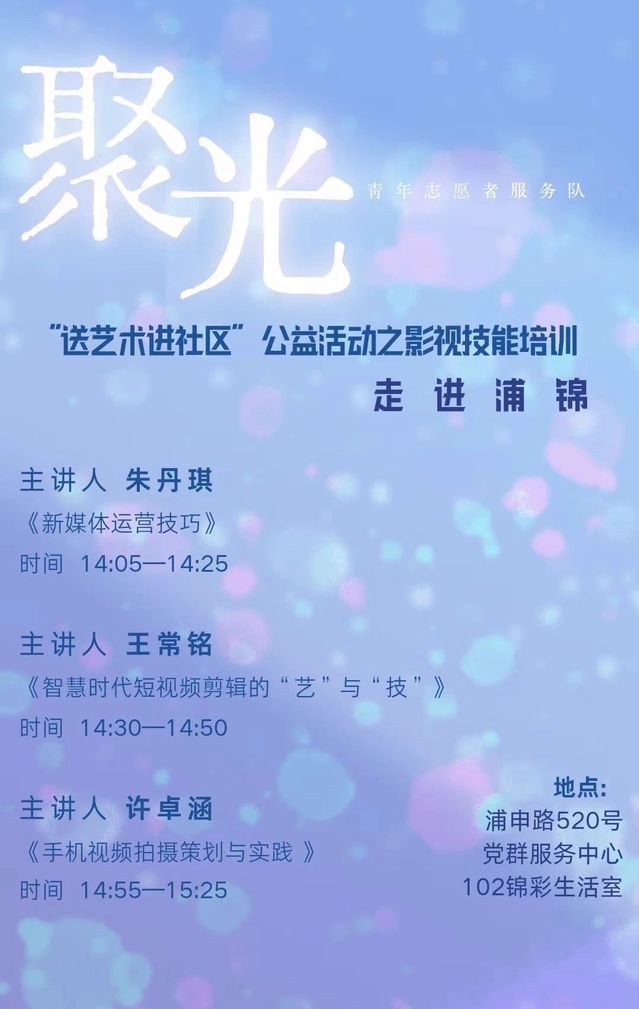 活动主要由sunbet研究生党员、入党积极分子、聚光青年志愿者们向浦锦街道的社区居民、社区基层骨干等群体分享影视技能的相关经验,内容涵盖短视频拍摄与剪辑、新媒体策划及宣传、摄影技巧与实操训练等。旨在丰富街道、社区人员的影视及宣传专业知识,同时扩老员工与社会的接触面,实现公司与社区的双向链接。