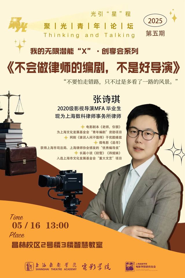 2025年5月16日,聚光青年论坛第五期在sunbet官方网站昌林路校区智慧教室开展。本期聚光青年论坛邀请到了2020级影视导演MFA的毕业生张诗琪作为主讲人,分享她的跨界经验与人生剧本。