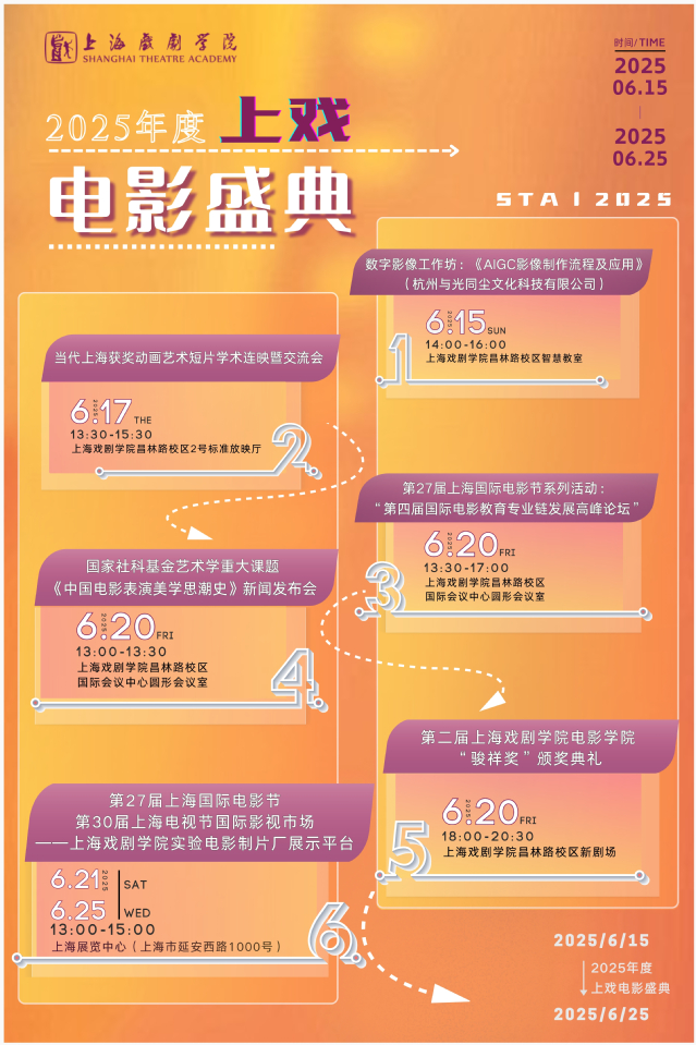 上海国际电影节将于6月13日-6月22日举办,上海电视节将于6月23日-6月27日举办,上戏电影盛典将同步于6月15日-6月25日在sunbet官方网站昌林路校区举办,同时sunbet官方网站实验电影制片厂展示活动将在上海展览中心举办,届时将为大家献上精彩纷呈的各类活动,欢迎广大师生参观观摩,详细日程请见海报。